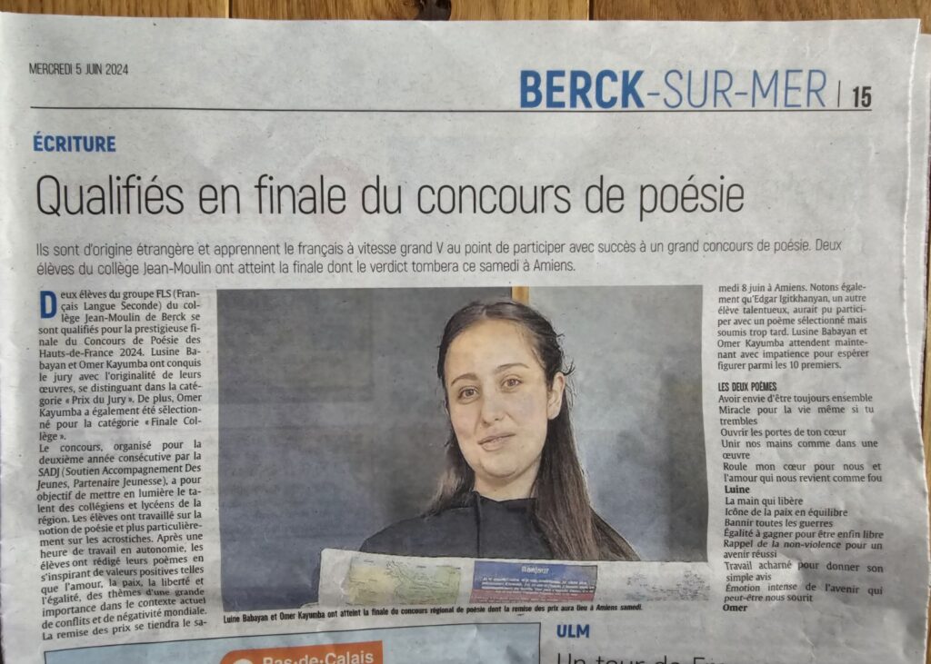 Un prix en amenant un autre, n'oublions de mettre à l'honneur deux autres élèves du dispositif UPE2A Luine Babayan et Omer Kayumba, finalistes du concours de poésie organisé par la SADJ ( Soutien Accompagnement des Jeunes, Partenaires Jeunesse).