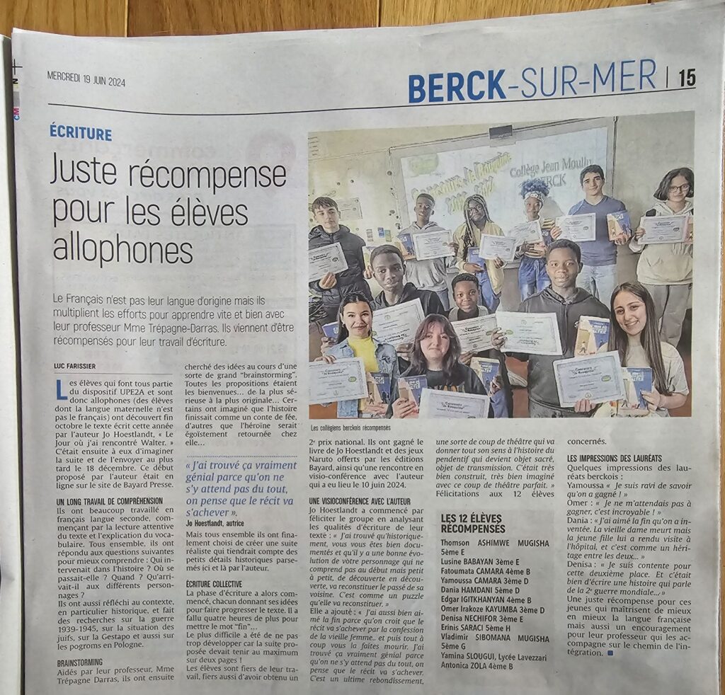 Les élèves du dispositif UPE2A du collège Jean Moulin de Berck ont été récompensés pour leur travail d'écriture. Lauréats du 2ème prix national du concours « jeunes écrivains, Je Bouquine », c'est après avoir pris connaissance des premières pages du dernier roman de Jo Hoestland, « Le jour où j'ai rencontré Walter » que les auteurs en herbe ont eu comme tâche d'imaginer la suite..