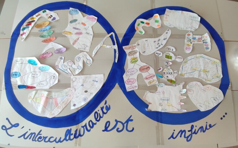 Les élèves de la classe de 5e SEGPA et les élèves du dispositif UPE2A de Mme Martin du collège Simone de Beauvoir de Villeneuve d'Ascq ont eu l'occasion de se rencontrer pour un travail riche autour de l'interculturalité. A travers l'activité des constellations, ils ont ainsi pu échanger autour de leurs différences et de leurs points communs. Leur production visuelle finale représente l'infini de l'interculturalité.