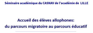 Le séminaire CASNAV 2023 a eu lieu le Mardi 5 Décembre 2023 à l'INSPE de Villeneuve d'Ascq. Il avait pour objectif de parfaire les connaissances de chacun au sujet de l'accueil des élèves allophones et de leurs familles, depuis leur arrivée sur le sol français jusqu'à leur accueil dans les établissements scolaires, et de l'effet psychologique de cet accueil.